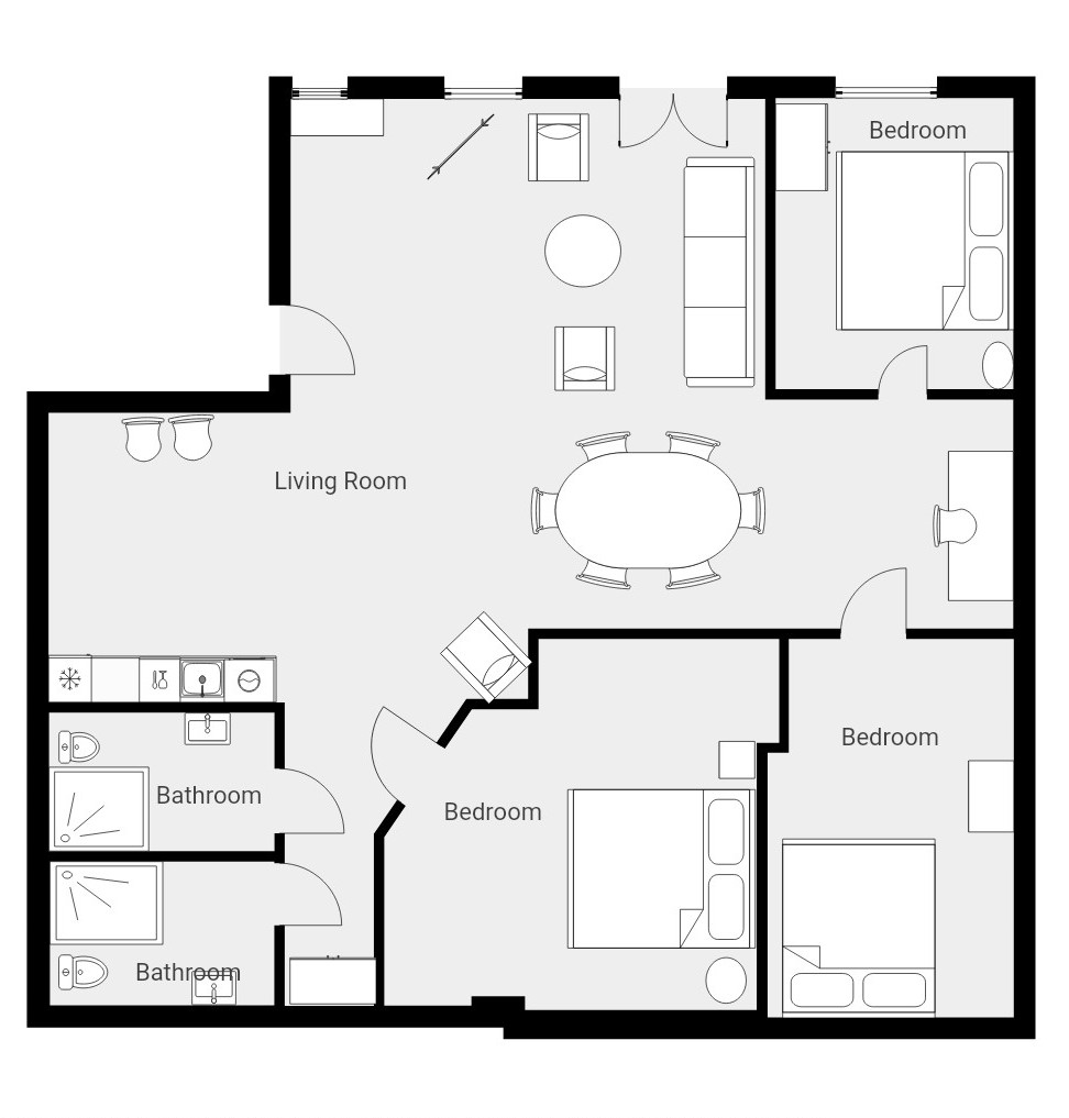 De tre soveværelser har kingsize-senge, der kan deles op til enkeltsenge, hvis det foretrækkes. Det ene af disse værelser tilbyder fredelig udsigt over den stille gårdhave, mens det andet er uden vinduer – ideelt for gæster, der foretrækker et mørkere og hyggeligere sovemiljø.