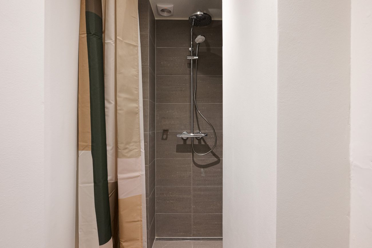 At the far end, the brand new bathroom offers a clean and modern feel with fresh tiles, a spacious shower, and plenty of light.