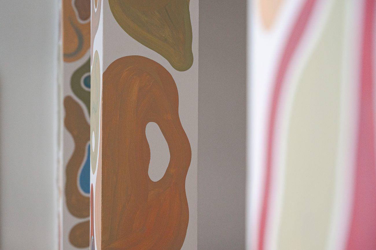 In the center of the room, the custom-painted pillars add character and local artistry to the otherwise minimalist design.